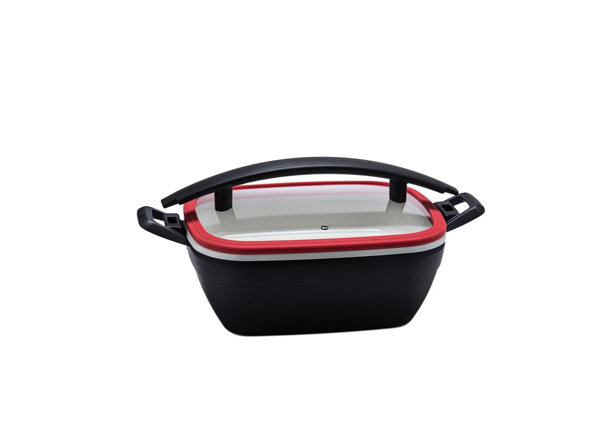 4.75 qt Rectangle Artisan Chafer with Black Handle and Porcelain Food Pan - Red Trim