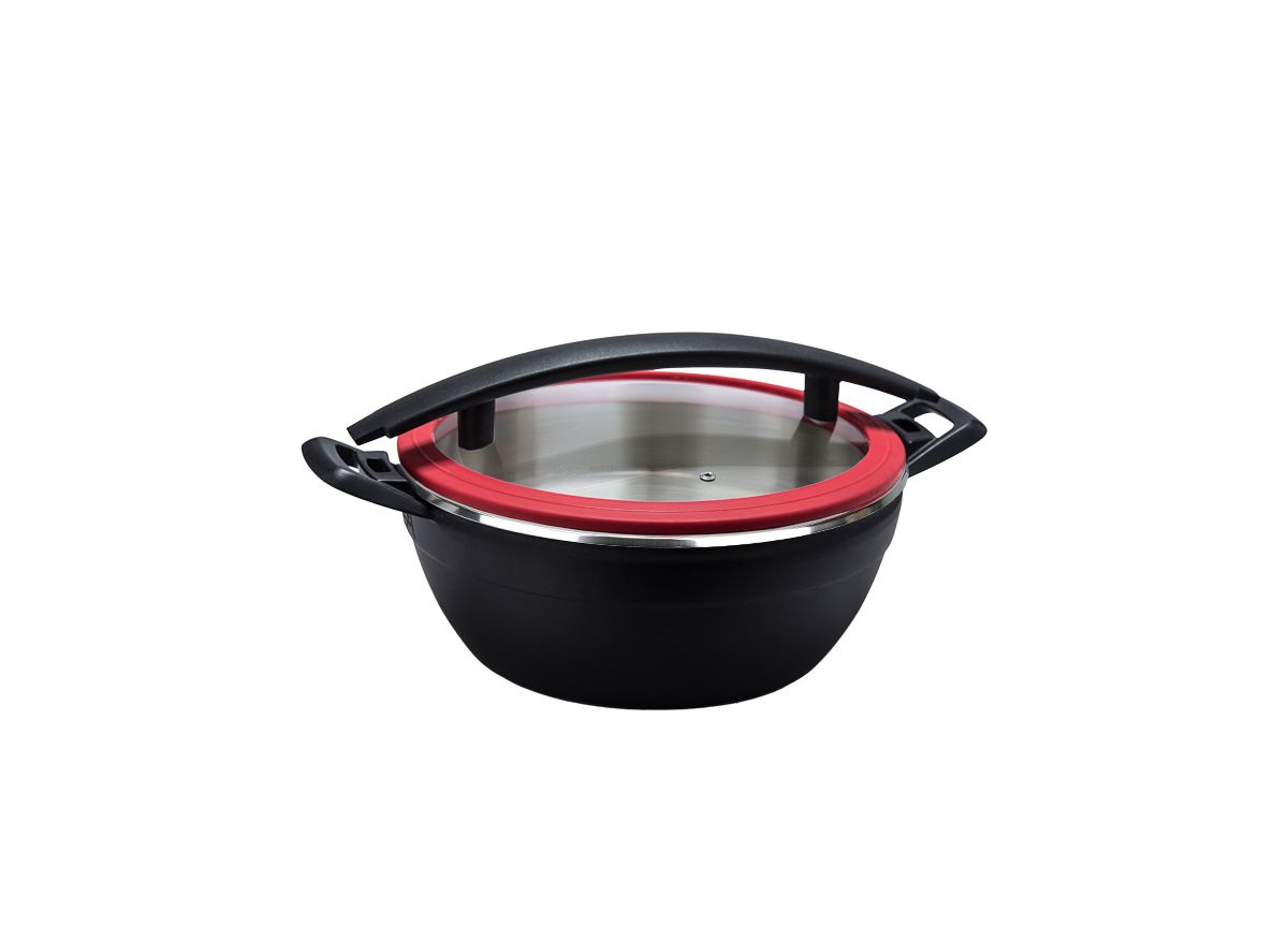 4.75 qt Round Artisan Chafer with Black Handle and Food Pan - Red Trim