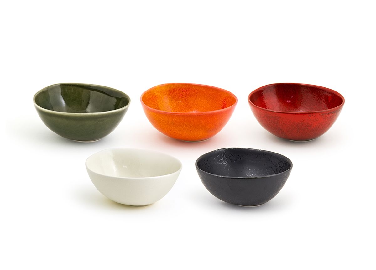 Durable, high-temperature porcelain in an oval organic shape,with a colorful reactive glaze.