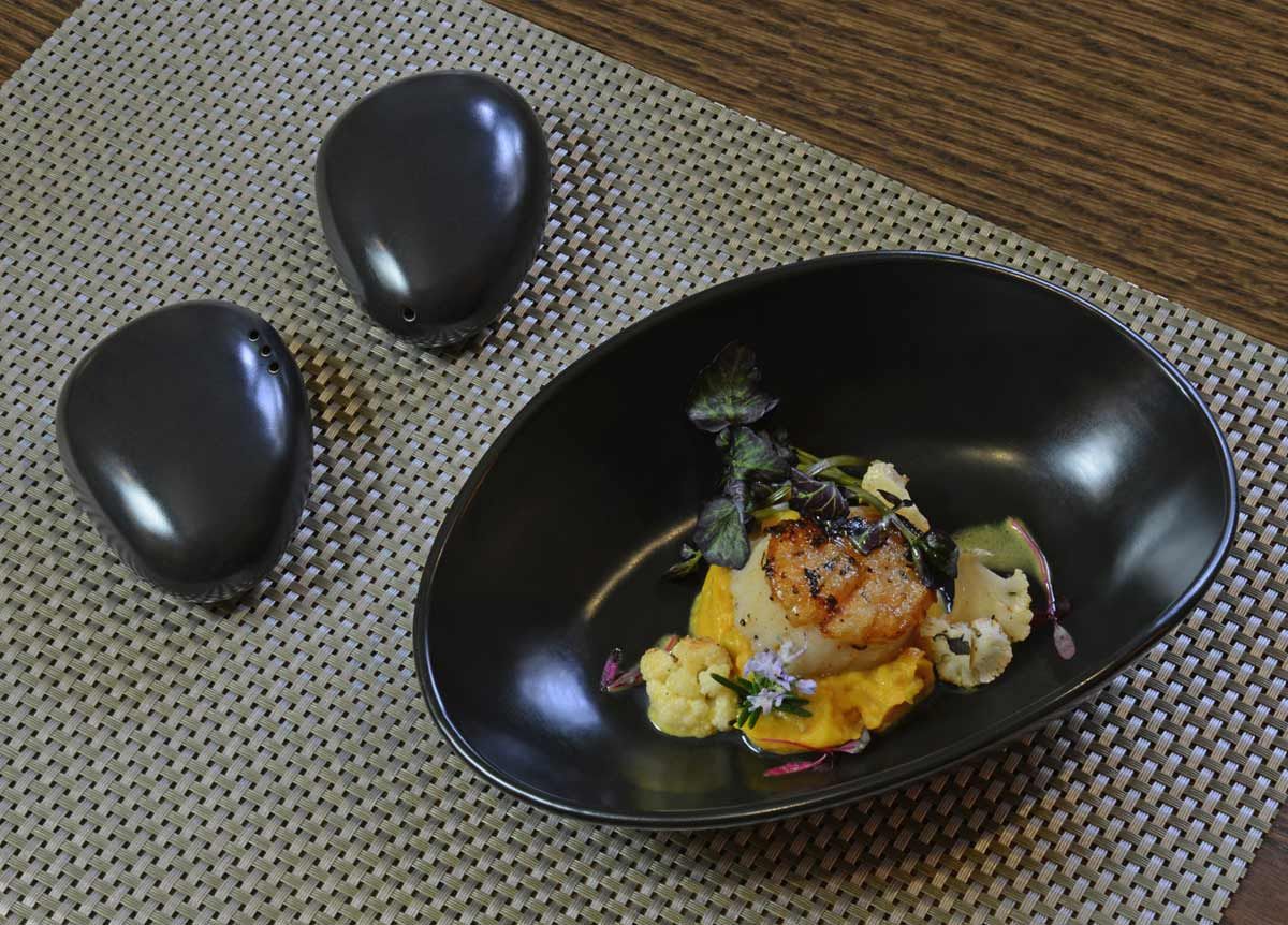 Durable, high-temperature porcelain in an oval organic shape,with a colorful reactive glaze.