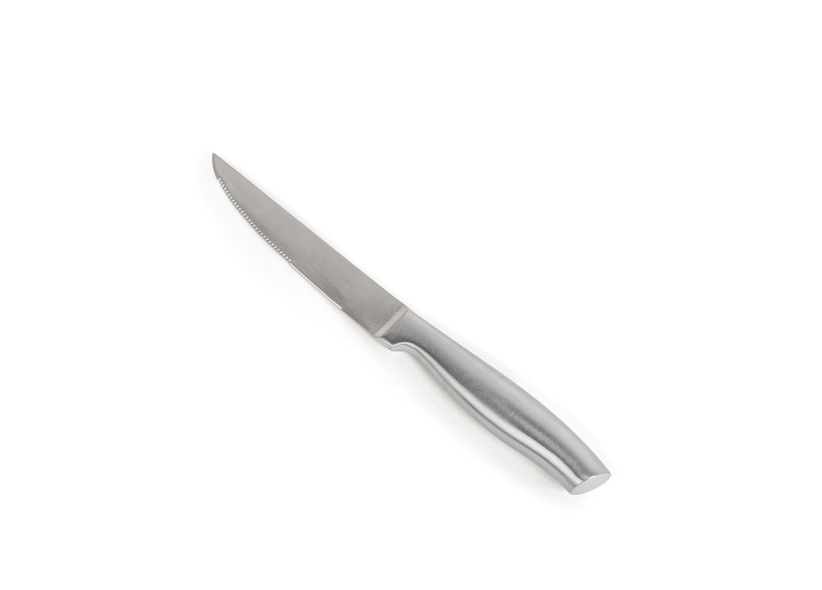 The durable 9.75" Serrated Steak Knife with Stainless Steel Handle features an 18/10 half-serrated blade that never needs sharpening. Its ergonomic, hollow handle provides a lightweight, comfortable grip and a sleek look that complements any collection.
